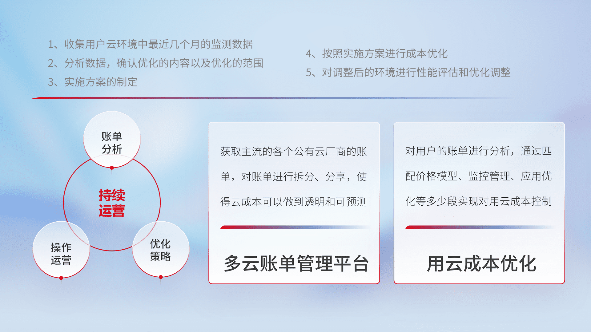 通过多云纳管,,,,以统一的资源数据模型把客户的云资源进行抽象和封装,,,进而实现对多云资源的统一操作,,保障云资源管理的可靠性、、、、稳定性与可用性。。。。量身定制化运维内容,,,,配置、、、、开发运维、、、补丁管理、、备份、、监控、、认证和访问管理、、审计和日常巡检等,,,,保障在用云过程中的可靠度,,,,稳定度以及高可用率。。。。