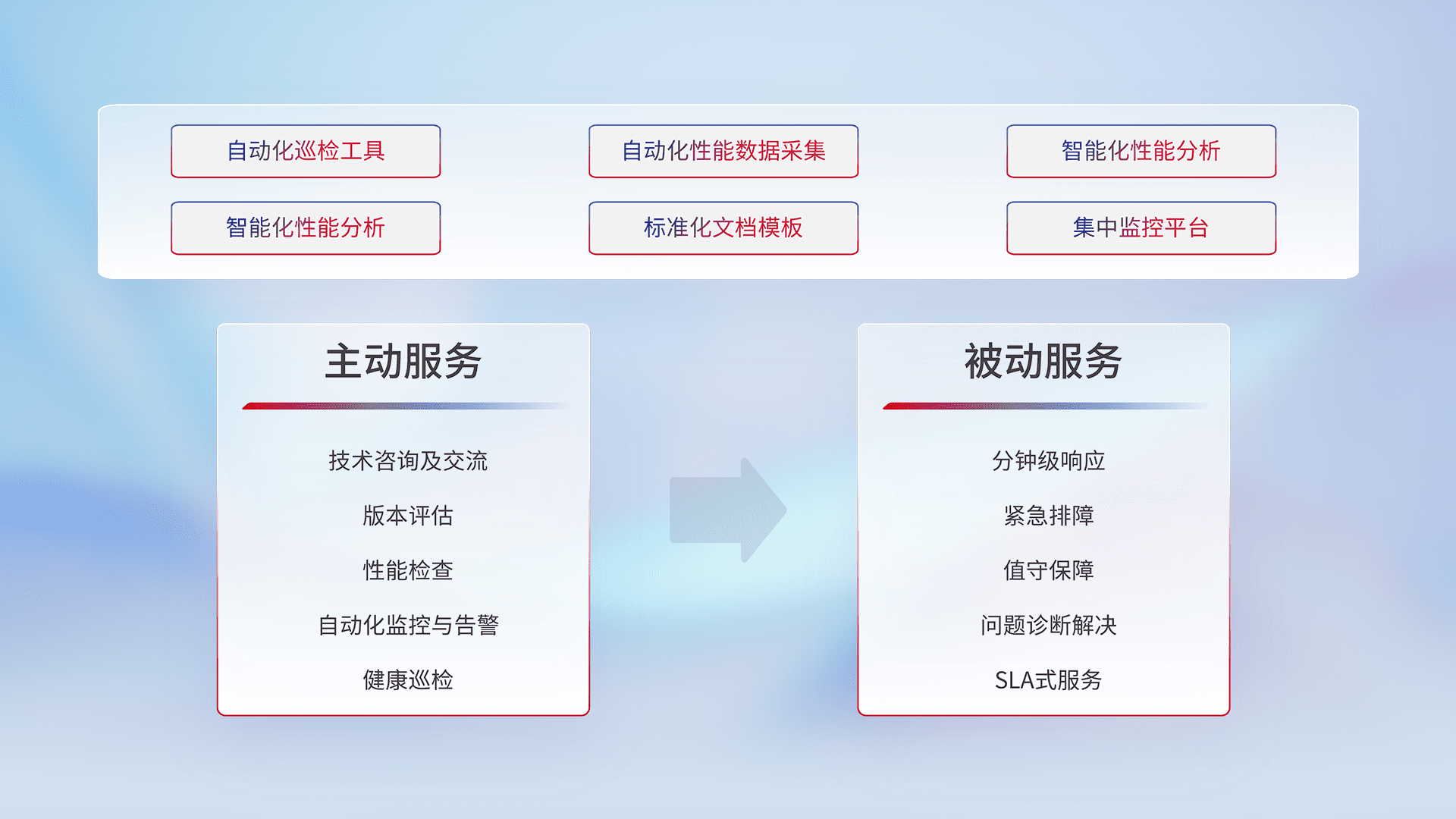 智能化工具和标准化文档,,,,保障服务质量,,,,提供主动服务(包含技术咨询、、版本评估、、、、性能检查、、自动化监控与告警、、健康巡检)和被动服务包含(分钟级响应、、紧急排障、、、、值守保障、、、、问题诊断解决、、、SLA服务)。。。。
